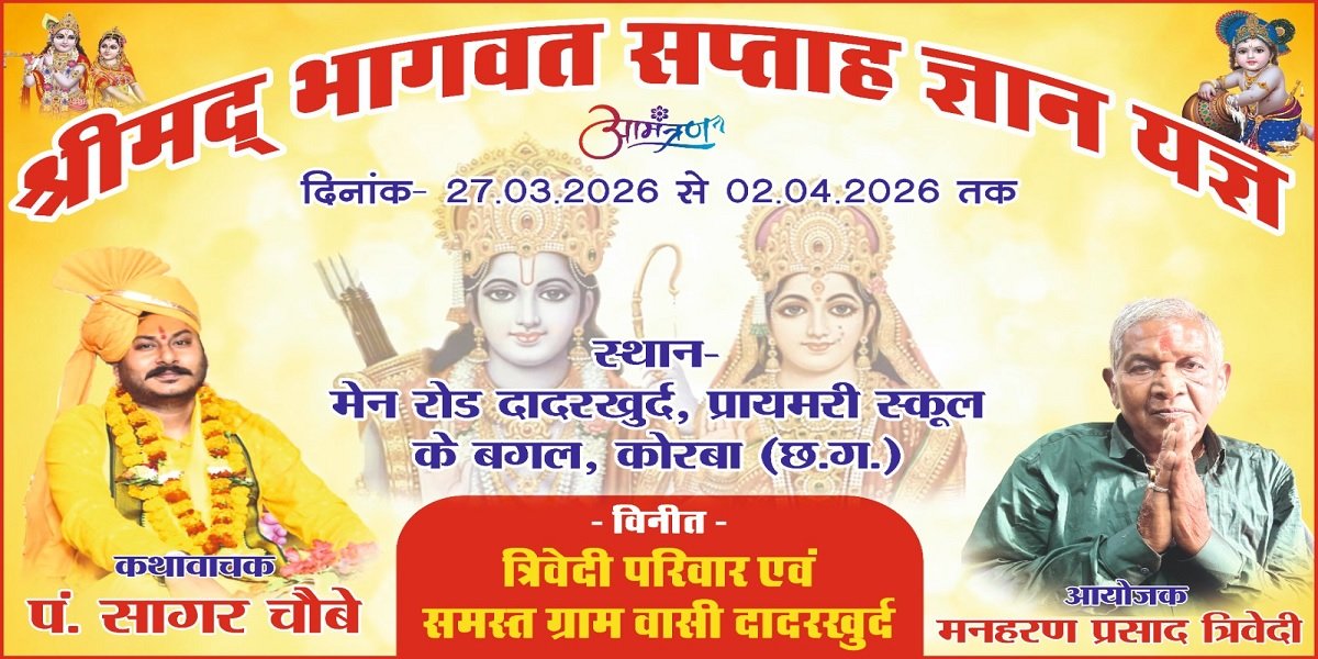 कोरबा की धरा पर बहेगी भक्ति की रसधार: श्रीमद् भागवत सप्ताह ज्ञान यज्ञ का भव्य आयोजन ग्राम ​दादरखुर्द में 27 मार्च से उमड़ेगा श्रद्धा का सैलाब, सुप्रसिद्ध कथावाचक सागर चौबे करेंगे कथा का अमृत वर्षा