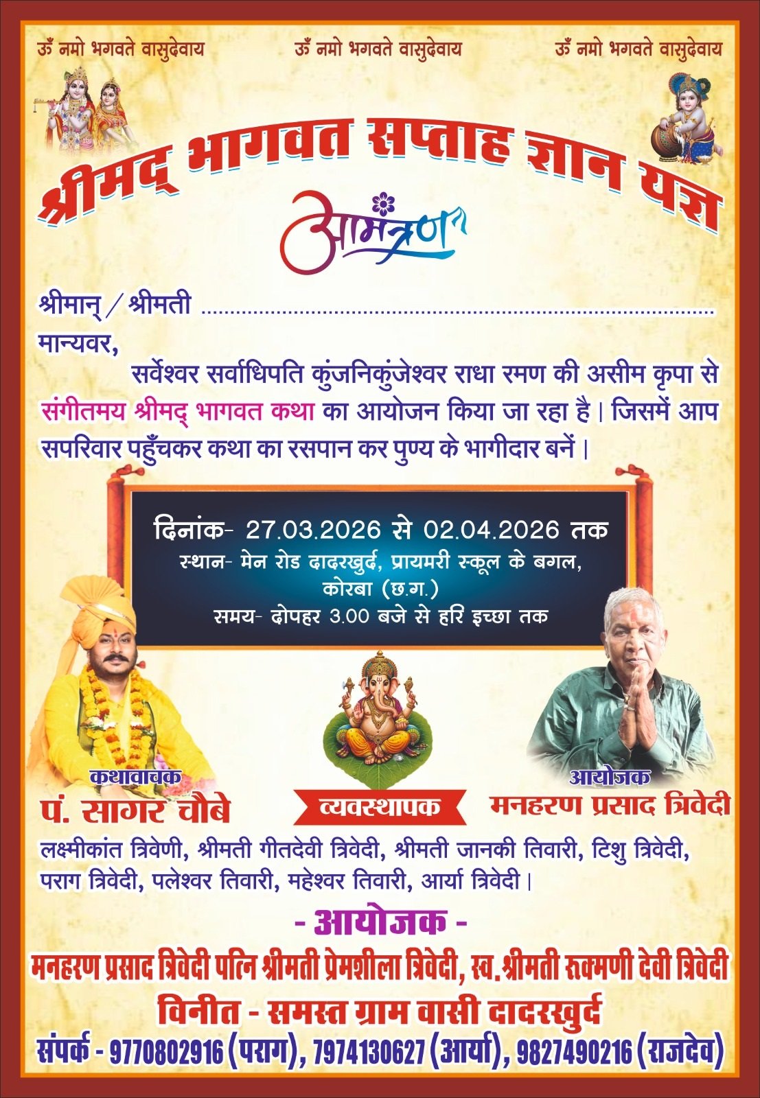 कोरबा – छत्तीसगढ़ कोरबा के समीपस्थ ग्राम दादरखुर्द की पावन धरा आगामी 27 मार्च से भक्ति के अनुपम रंग में सराबोर होने जा रही है। श्री राधा-रमण की अनुकंपा से त्रिवेदी परिवार के द्वारा ‘श्रीमद् भागवत सप्ताह ज्ञान यज्ञ’ का भव्य आयोजन किया जा रहा है।